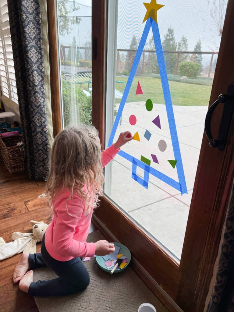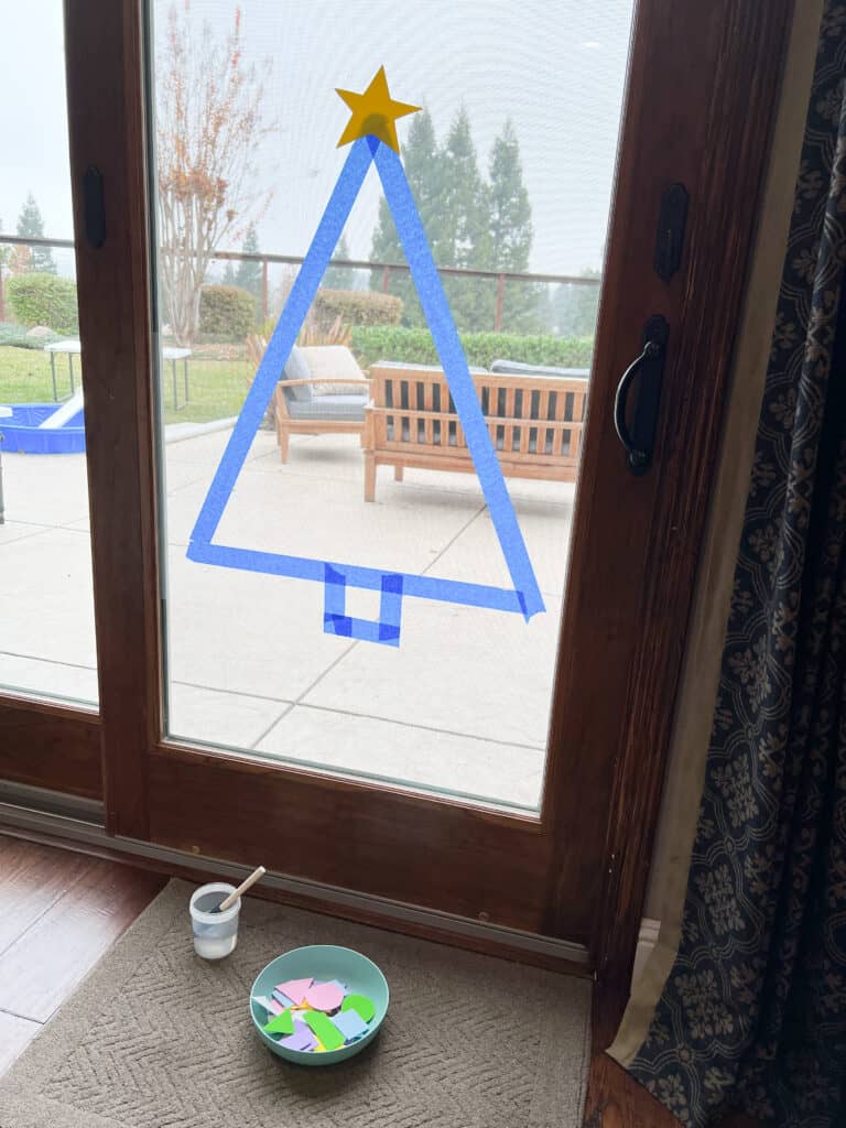 Prep ahead by taping a Christmas tree onto the window or easel using painter's tape.