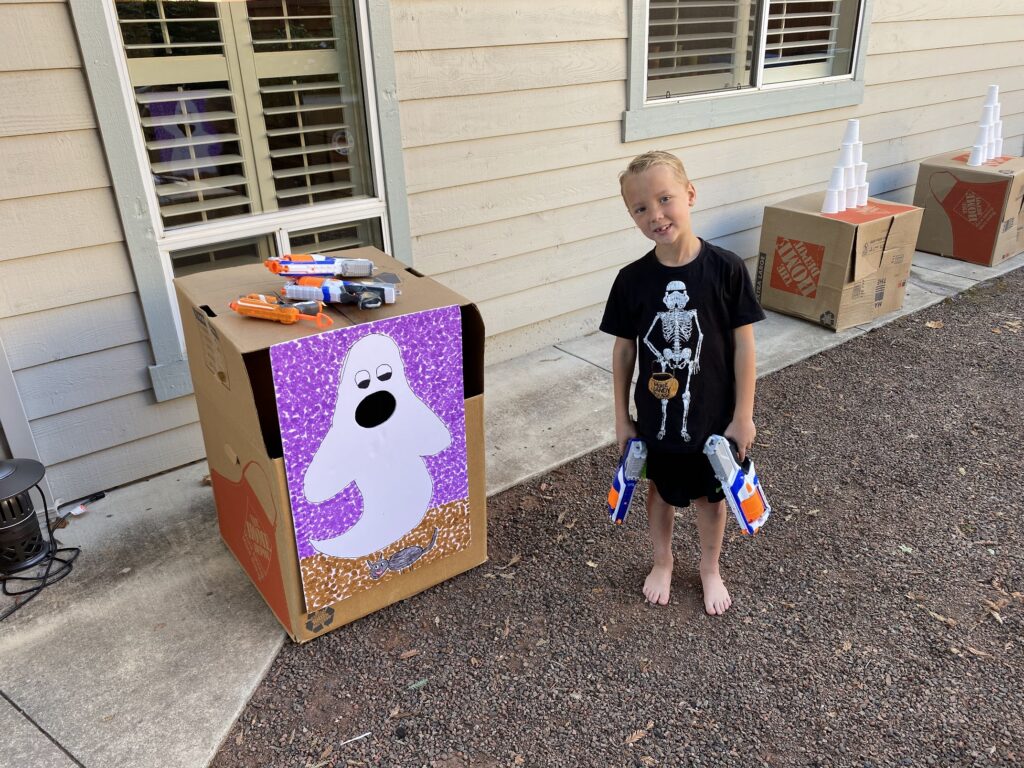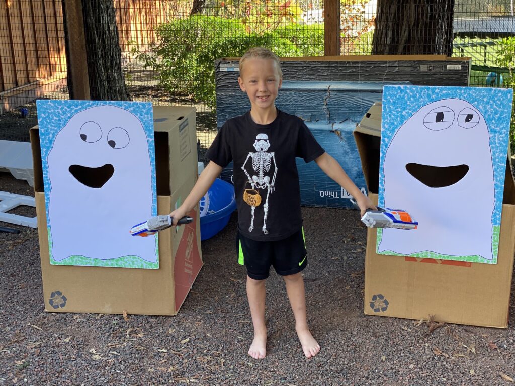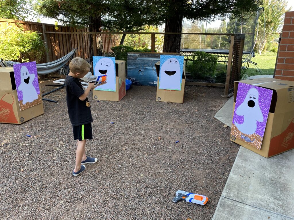 Once you have the ghosts set up, give the kids some Nerf blasters and see if that can Zap the Ghosts by aiming the Nerf darfs (or soft foam balls) into the mouths of the ghosts.