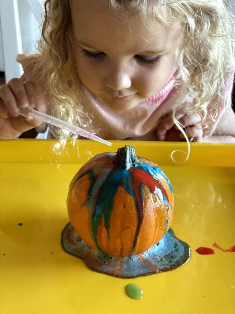 4. Once kids are done painting, give them a dropper (or pipette) and some vinegar! Encourage them to squeeze the vinegar onto the painted pumpkin and watch what happens!
