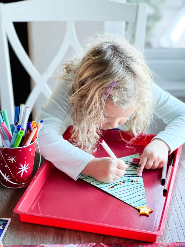 Sensory play and art activities, like this shaving cream tree activity, let kids have the opportunity to develop their self control and be creative. They also get to strengthen fine motor skills as they decorate the trees and play in the cream.