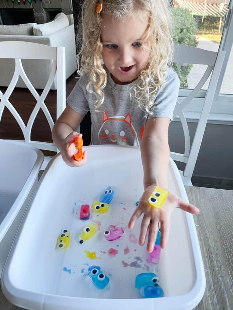 We like to add these into sensory bins or dish tubs and then add tons or other fun tools for sensory play! Scoops are fun to add as well once the googly eyes start melting.