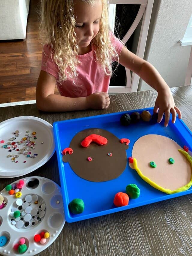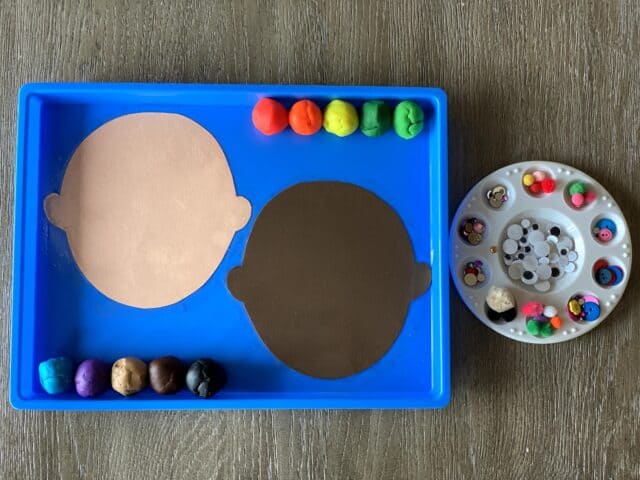 3. Grab some playdough and embellishments and let kids start building and creating! We used googly eyes, buttons, jems, and more. Kids can stick the playdough onto the face and then stick the embellishments on top of that to make them stick.