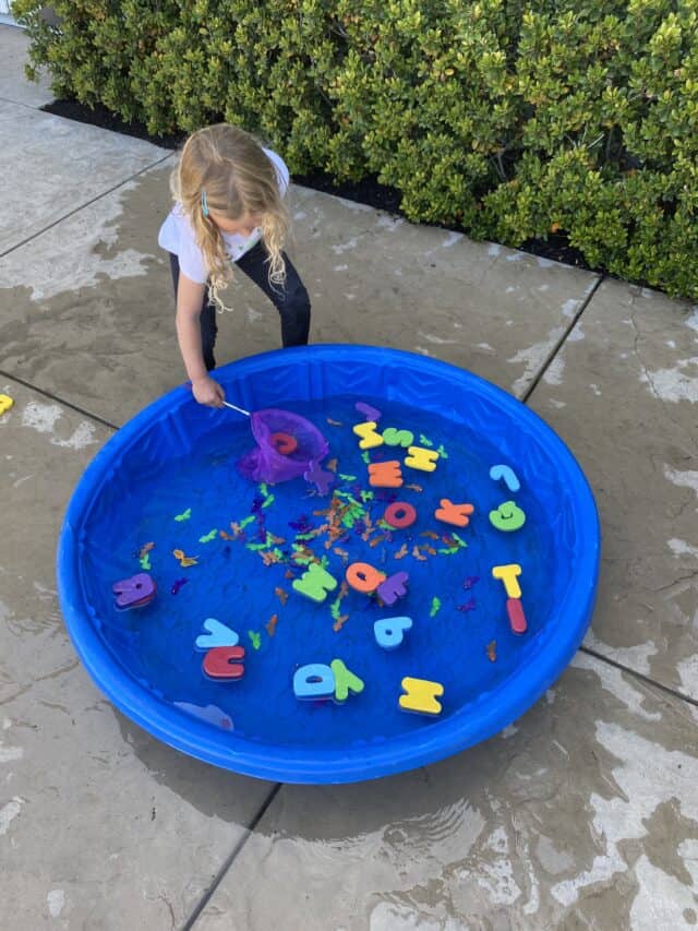 Need an outdoor alphabet activity? Try this easy letter recognition activity you can do in a kiddie pool with toddlers and preschoolers!