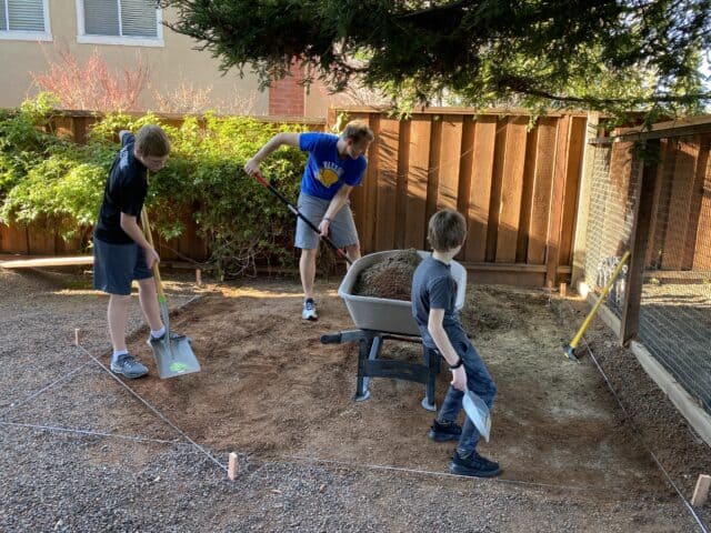 As you can imagine, my kids have been playing in their new construction backyard play area non-stop! Even my twelve year old (who helped build it), loves burying himself in the rocks and building and digging.