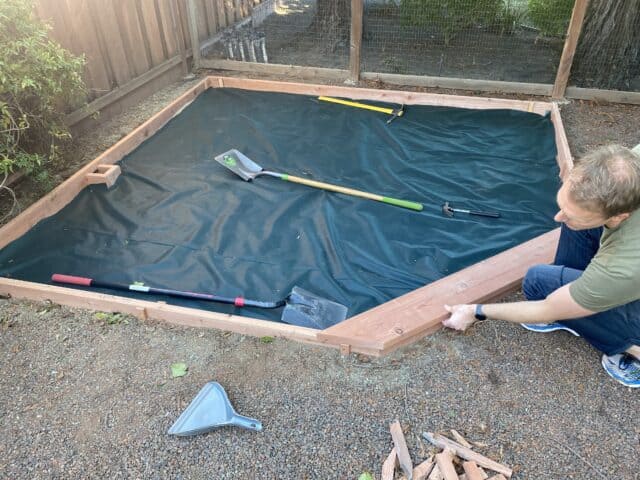 5. Next, we secured everything into place. My husband used stakes to anchor the sides down and make them extra secure.