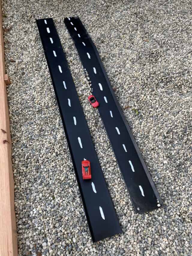 I used acrylic paint to paint some simple white lines on the baseboards and then we let them dry for a few hours. Once they were dry, we added some toy cars and kids were ready to play!