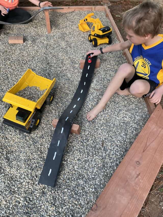 In addition to using wood to build the rock box, my husband also cut some extra pieces of wood that the kids could use in the play area for building. These wood pieces come in handy for building car ramps, digging, and making all sorts of creative things.