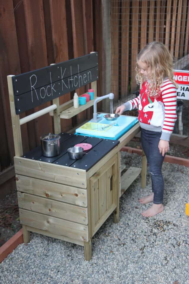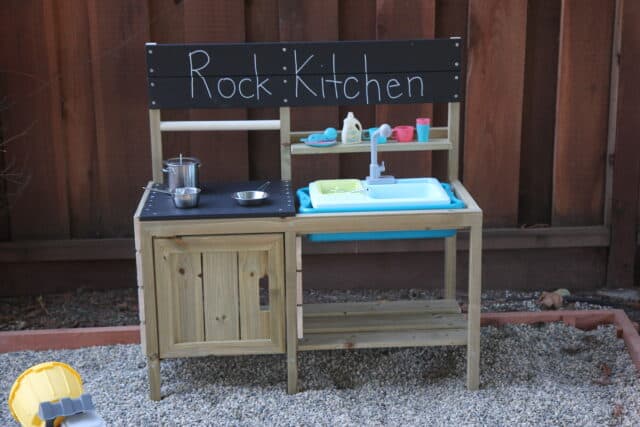 We purchased a fun Mud Kitchen from Wayfair (super similar to this kitchen) and decided to turn it into a rock kitchen for simple imaginative play!