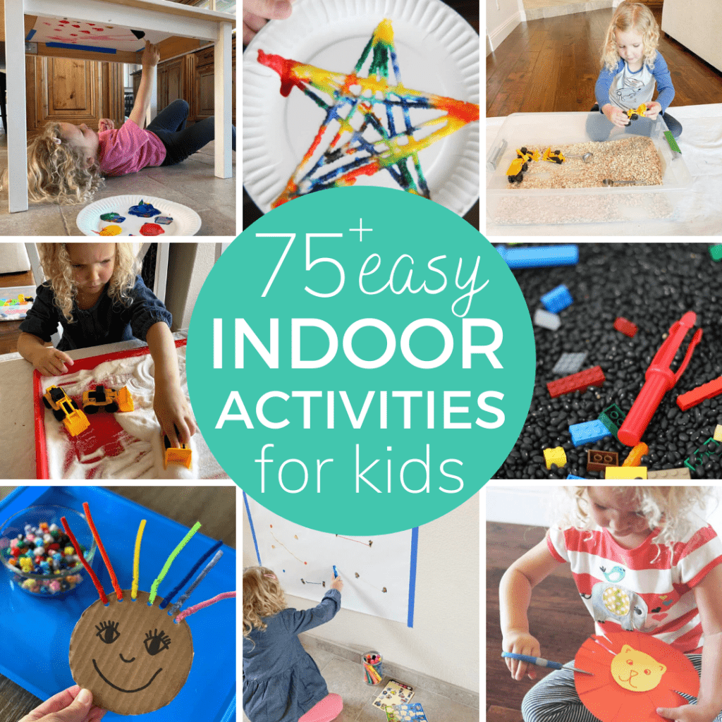 Scroll down to the activity that looks interesting to you and click on the title to head over for the full tutorial! I gathered activity ideas from my website along with a few from my favorite creative friends for this awesome list of indoor activities for toddlers and preschoolers!