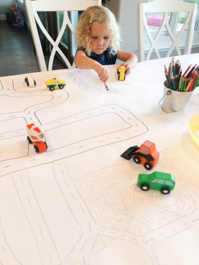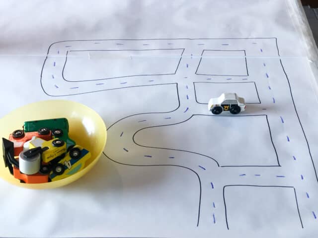 2. Draw roads or train tracks on the paper. Drive cars and trains around on them and play!