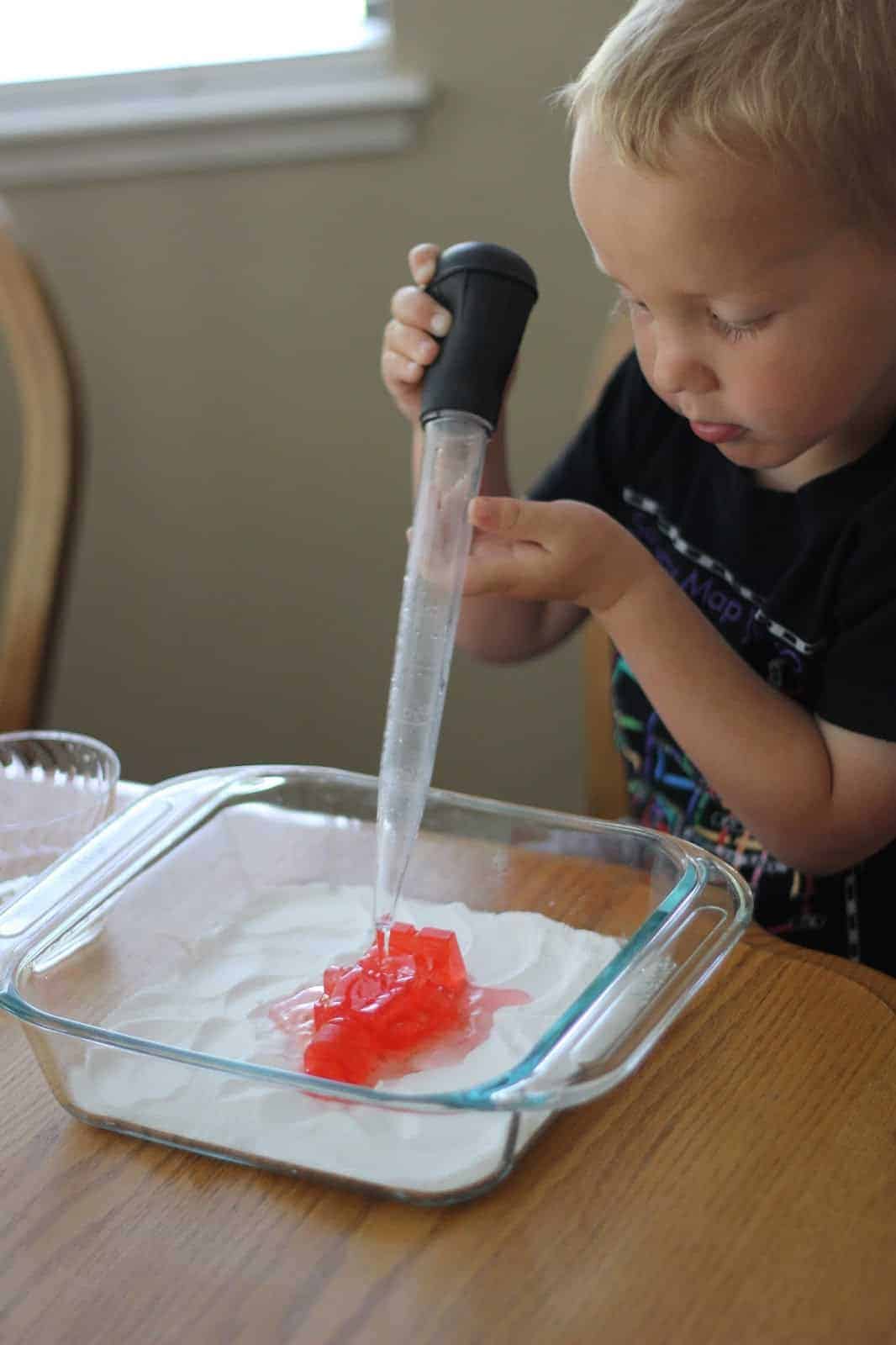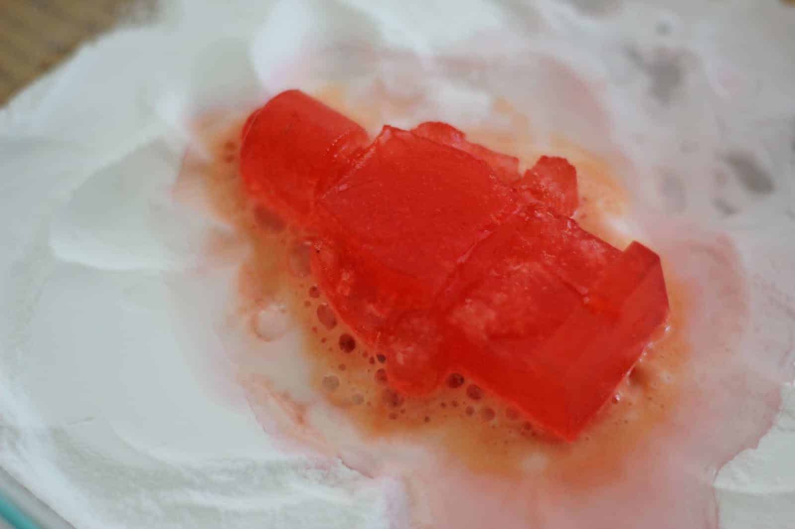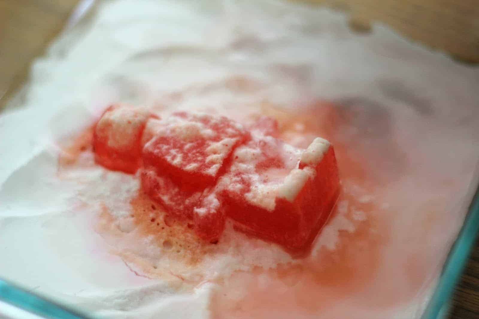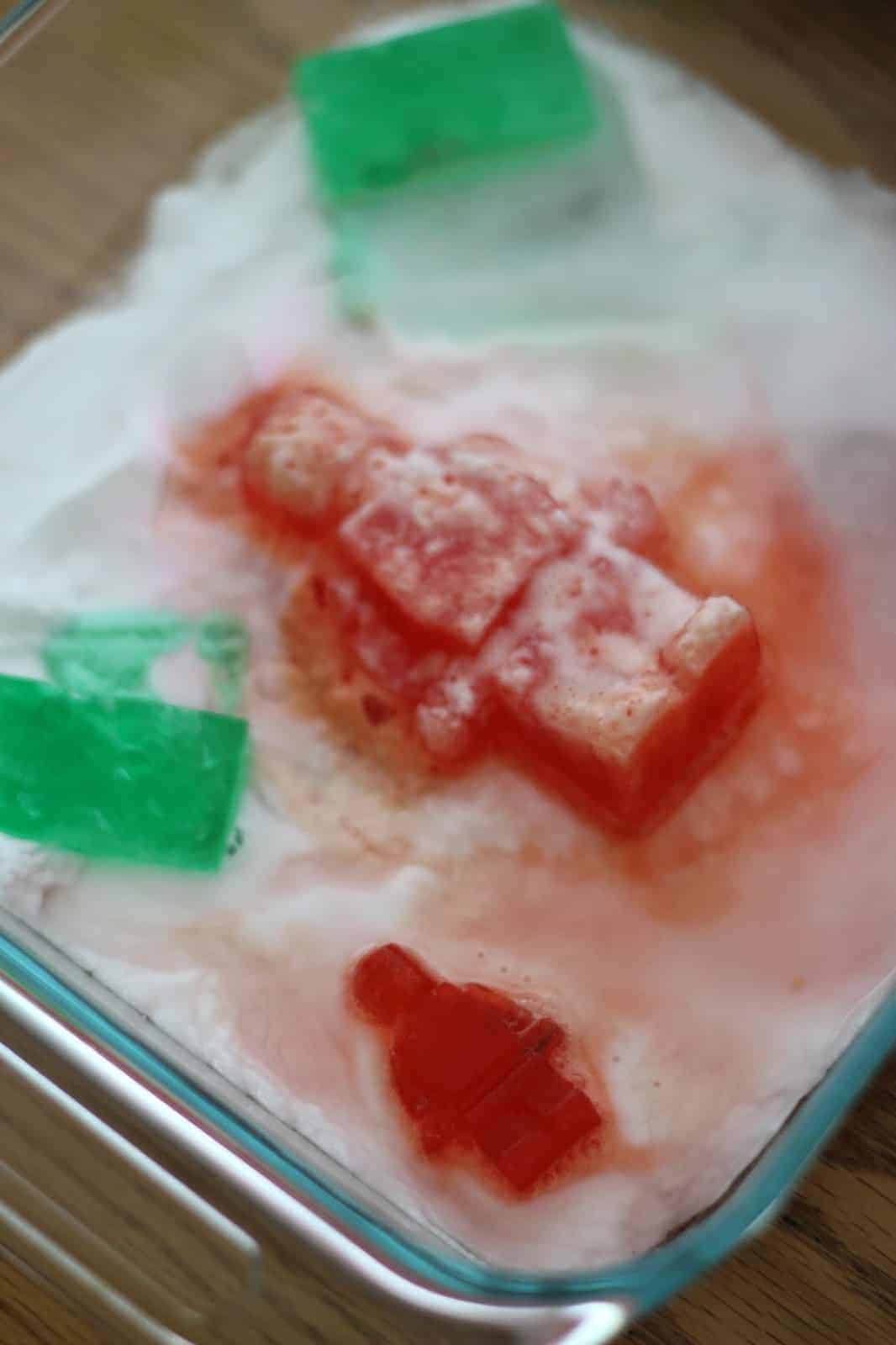 After we melted the frozen LEGO pieces a bit we added baking soda on top of the frozen pieces to see what would happen as well.