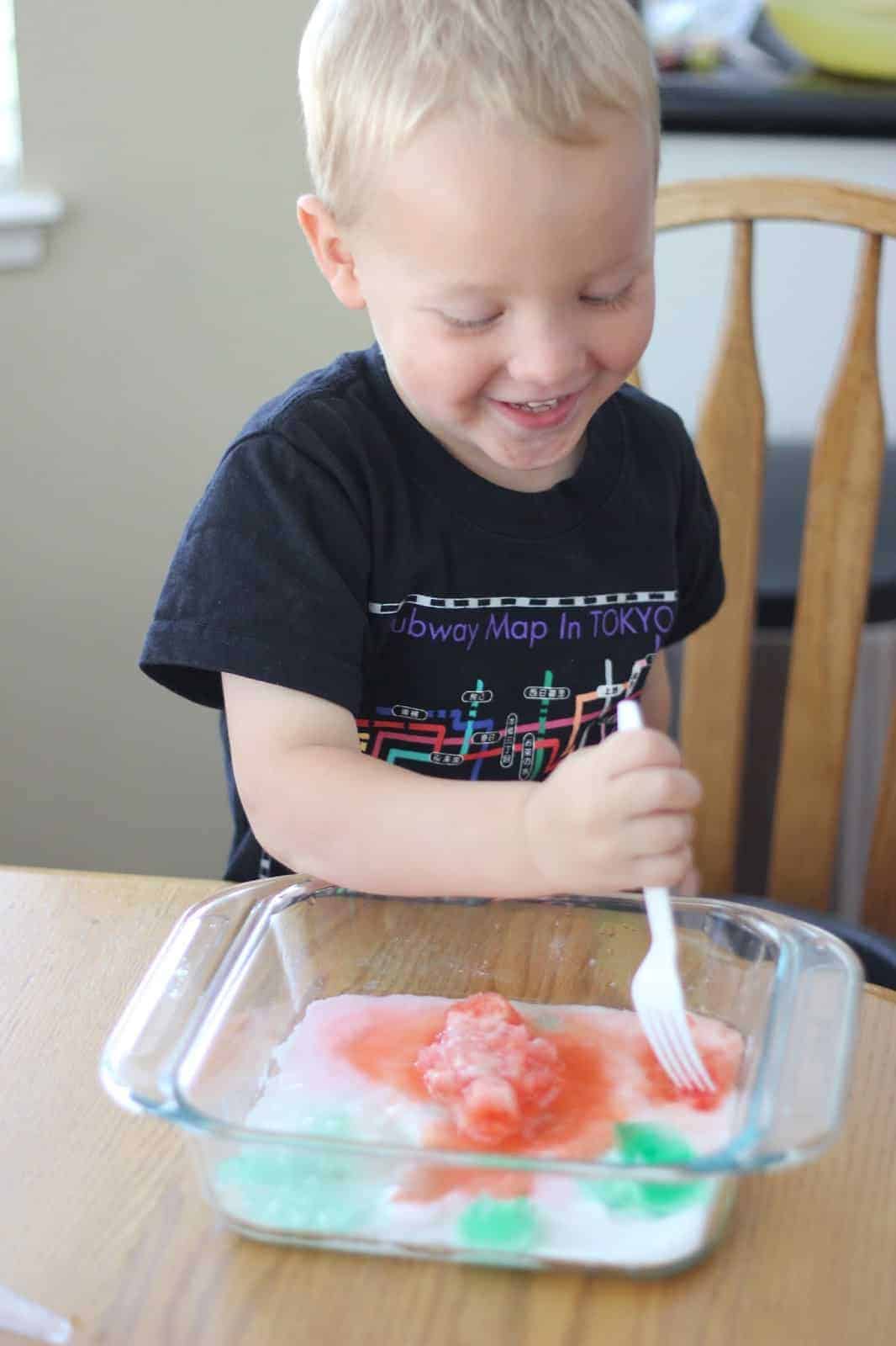 We surveyed the kids ahead of time to get their predictions about what would happen when we put the frozen vinegar on top of the baking soda.