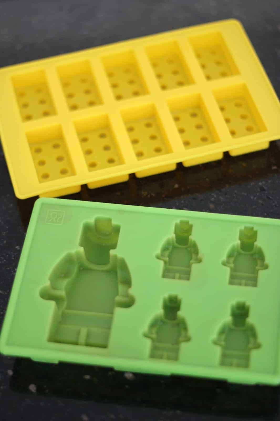 To get started you need to make your frozen LEGO bricks and minifigures! Mix vinegar with food coloring and then fill your LEGO molds. Next put the molds in the freezer overnight.