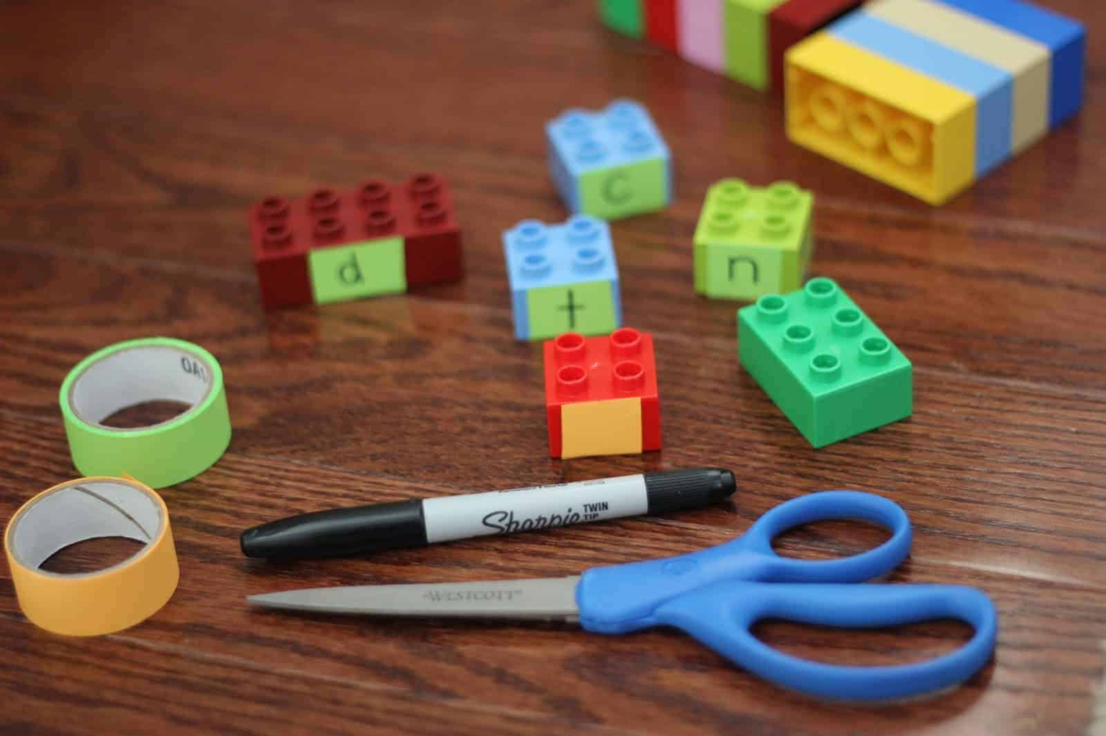 To get started I covered each DUPLO with some paper tape and wrote either a vowel or consonant on each brick.