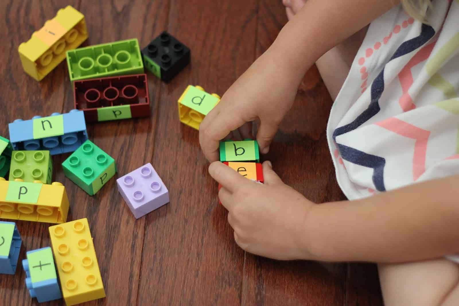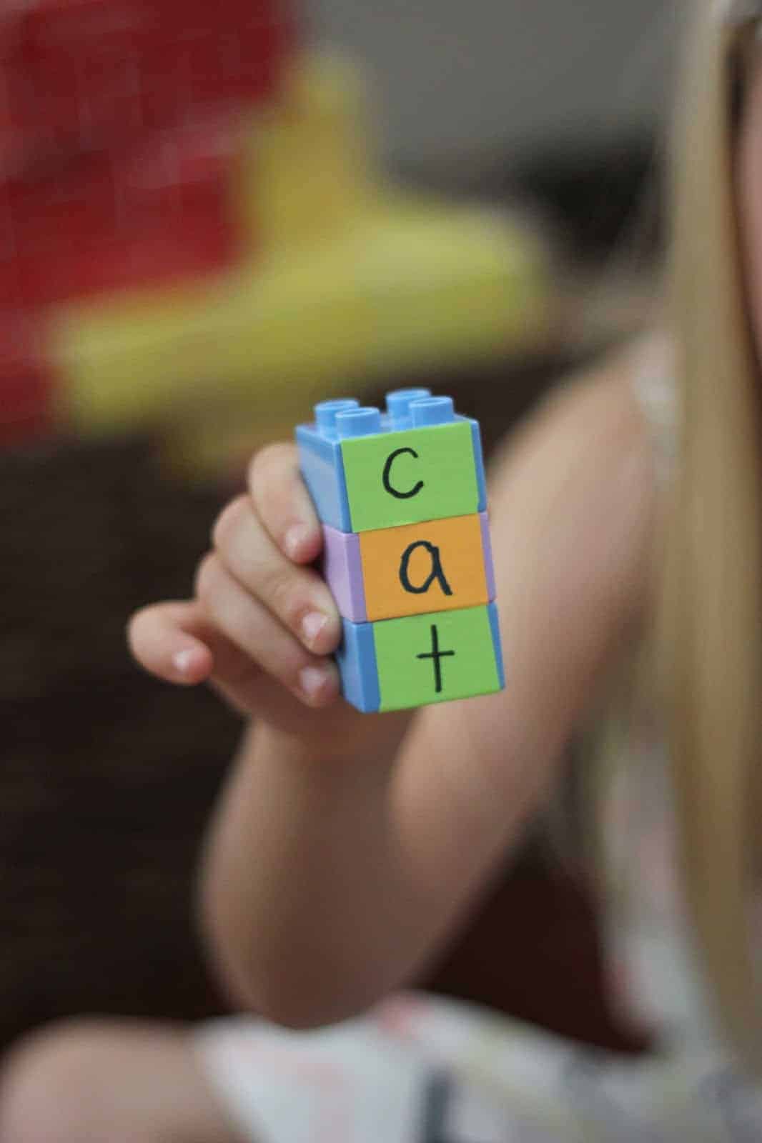 Next I used a simple CVC cheat sheet and called out CVC words for my daughter. Once I called out the word, she tried to sound it out and build it using the LEGO DUPLO bricks. She stacked the bricks together to build the words!