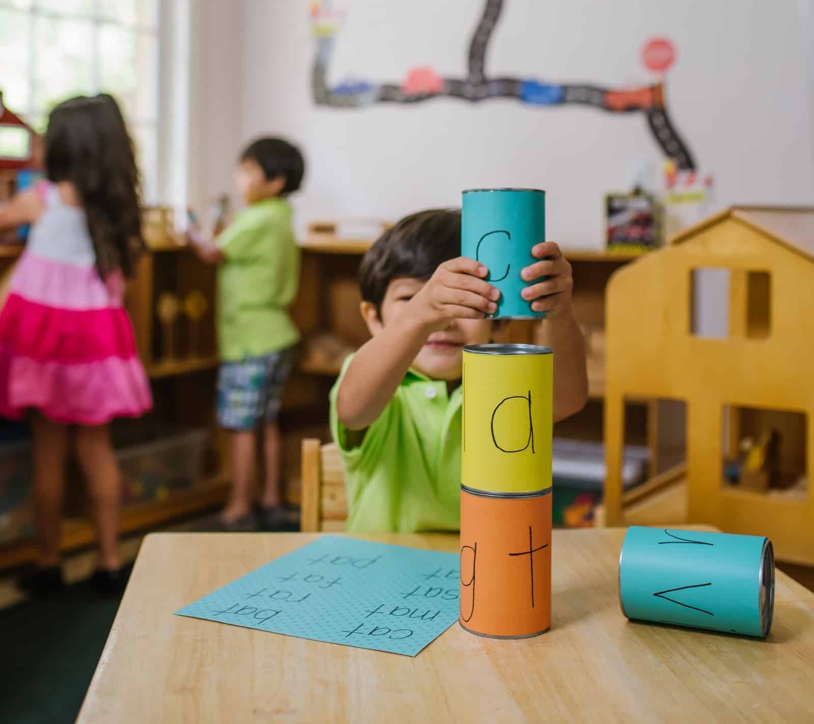 One of my favorite games in 100 Fun and Easy Learning Games for Kids is the STACK A WORD game! To play you stick paper around a can with different letters on it. Then kids work to stack the letters and make words. As they turn the cans they can change the words that they make.