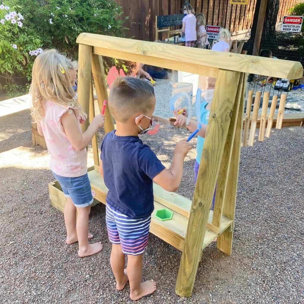 Whether you have an outdoor easel or just an old sheet that you throw over a fence, there are so many ways to be creative outside! These are some tools we love to use as we pull out the washable paint or other materials to create with.