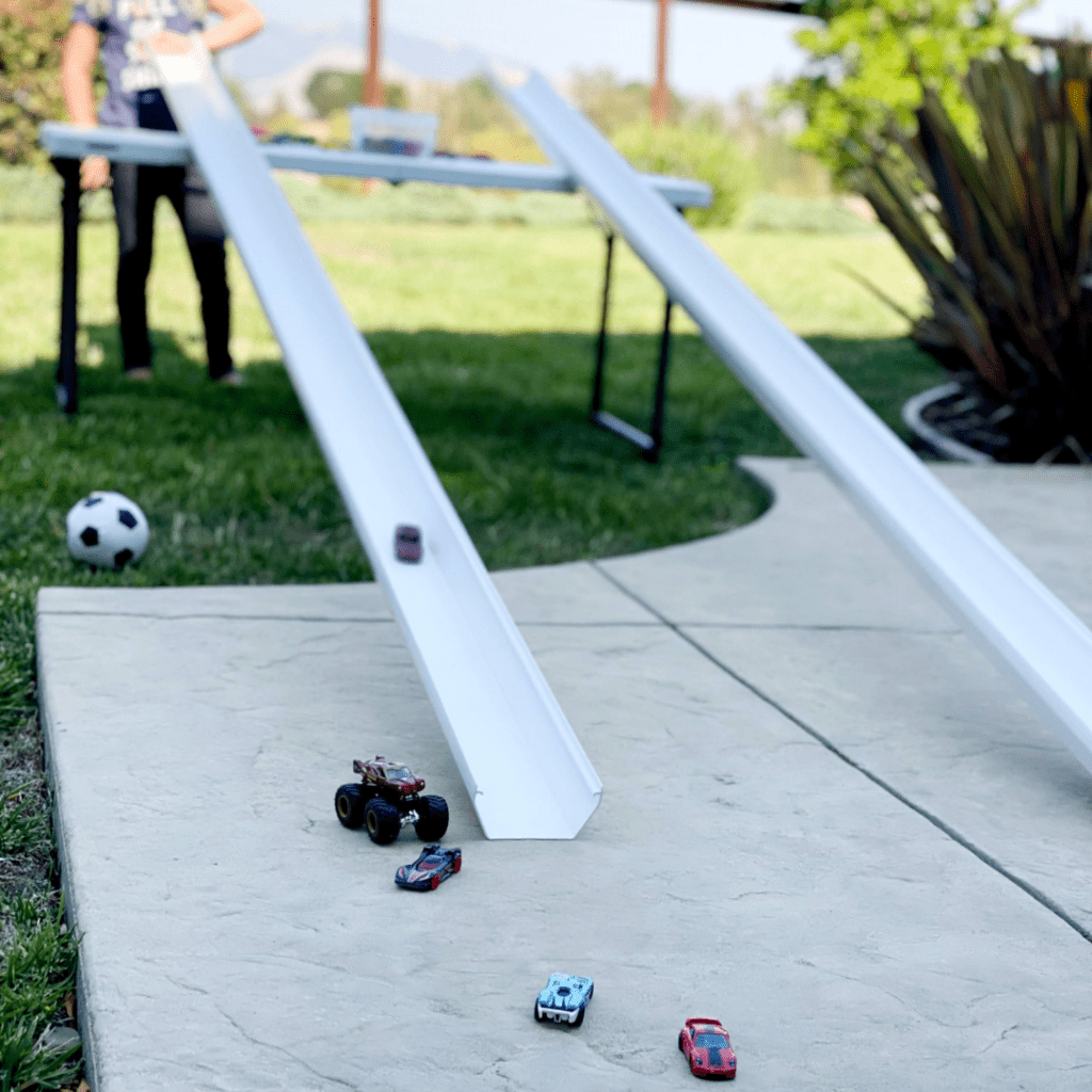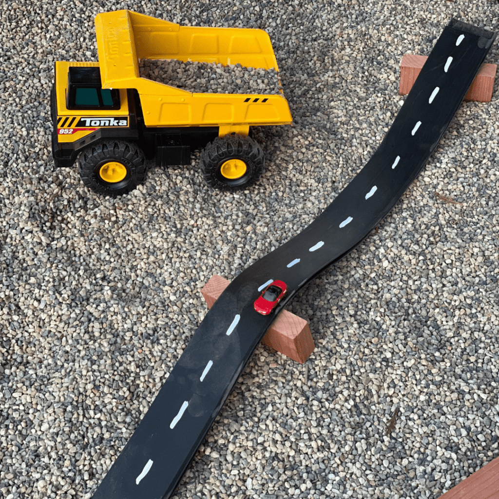 Outdoor vehicle play can be so fun! Use whatever materials you can find to make ramps and roads. We love our vinyl baseboard roads and vinyl rain gutters for inexpensive vehicle play fun as well.