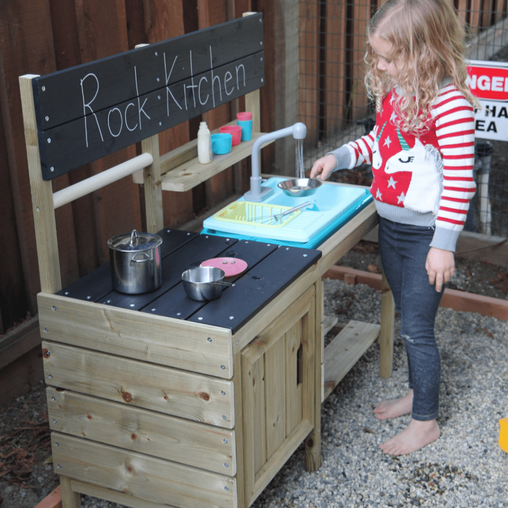 Pretend play is awesome in the mud kitchen, playhouse, or in a fun fort.