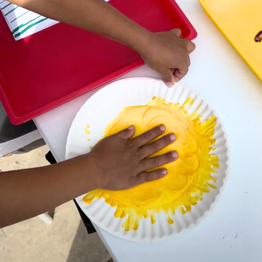- Next, have the child place their hand (palm down) in one color of paint and move it around to cover the whole palm.