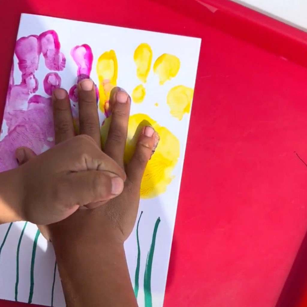 - Then have them place their hand on the card above the green "stems' to print their handprint "flower." Press hard to try and get the whole handprint onto the card.