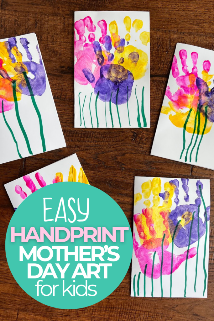 These simple handprint painted cards are adorable and super easy to make with toddlers and preschoolers! Parents love getting a personalized handprint card along with a gift or special note. You could also make this for a teacher or grandparent!