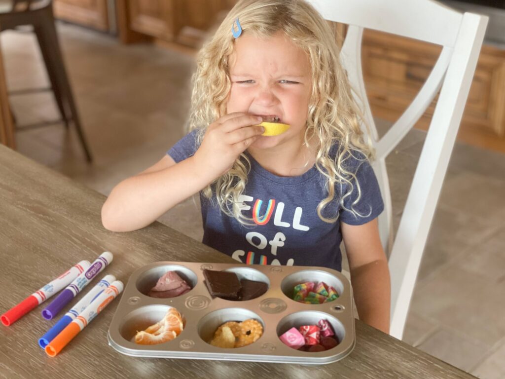 - Place several different foods/snacks/treats in a muffin tin (make sure to pick ones from all categories: salty, sweet, bitter, sour, and savory)