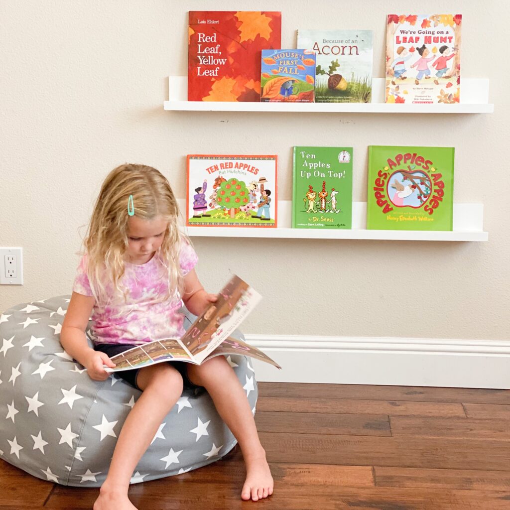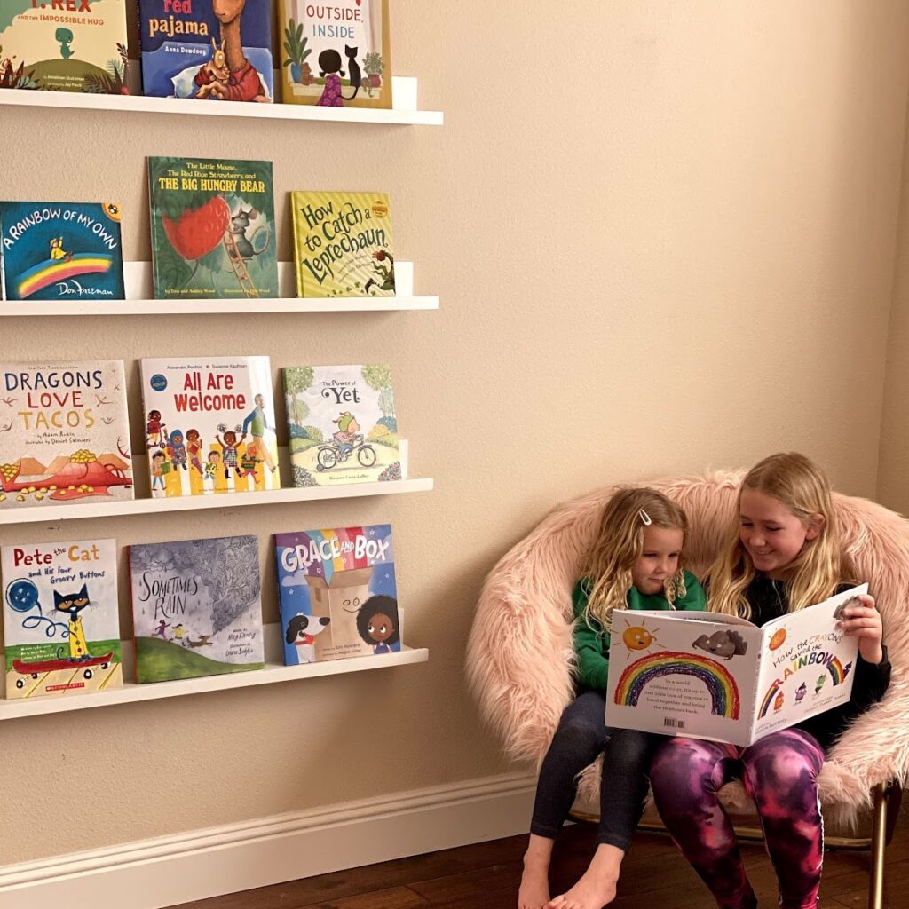 We love these floating book shelves to create a cozy reading nook for kids! The best part is that you can hang them at whatever height works for your kids and adjust as they grow!