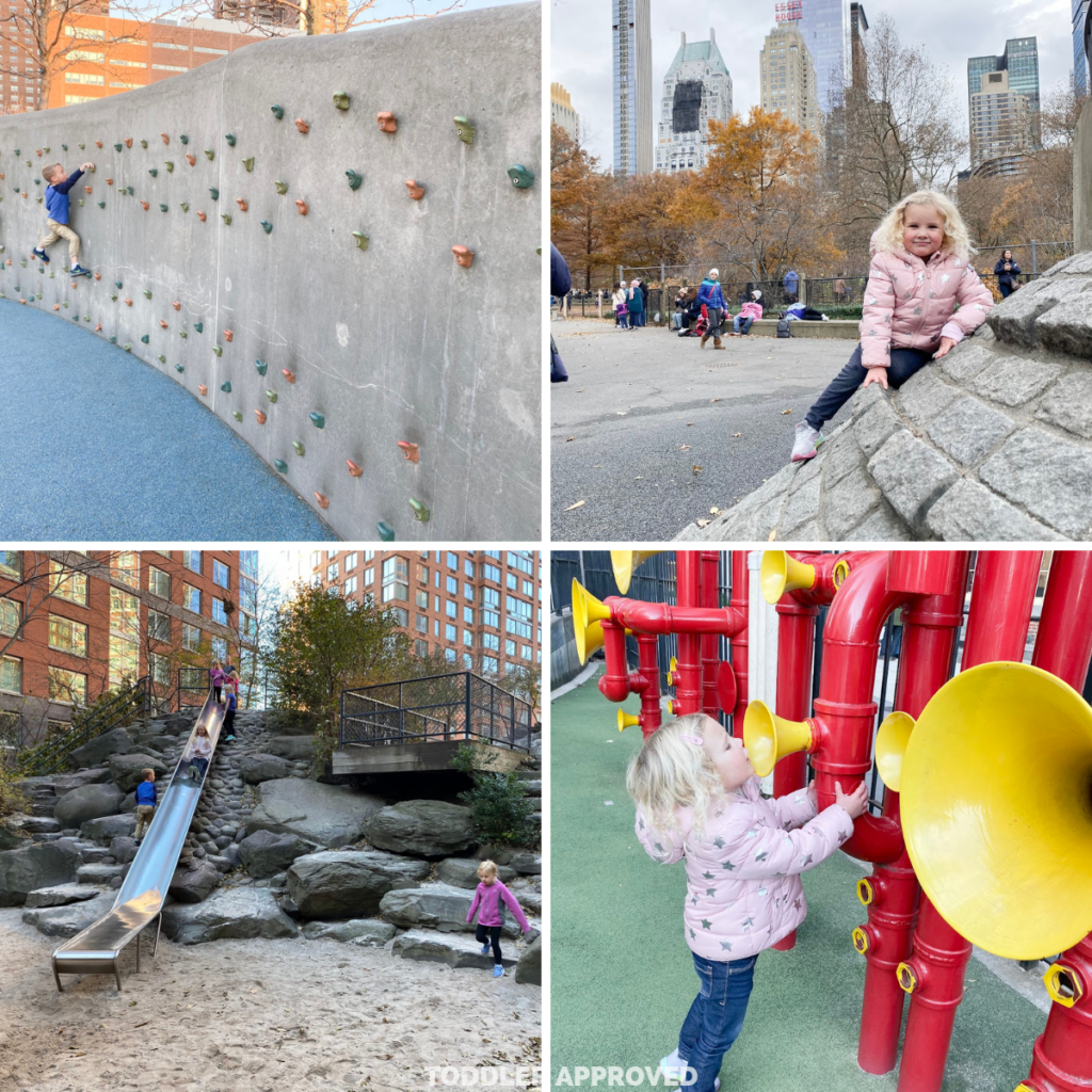 - Heckscher Playground – Central Park- This playground is one of our favorites! It's not far from the entrance to the park near 5th Avenue and has a gorgeous skyline view while kids play. There are also bathrooms available and fun things to play on for toddlers and bigger kids! We love to climb the big rocks nearby too. It's the largest playground in Central Park.