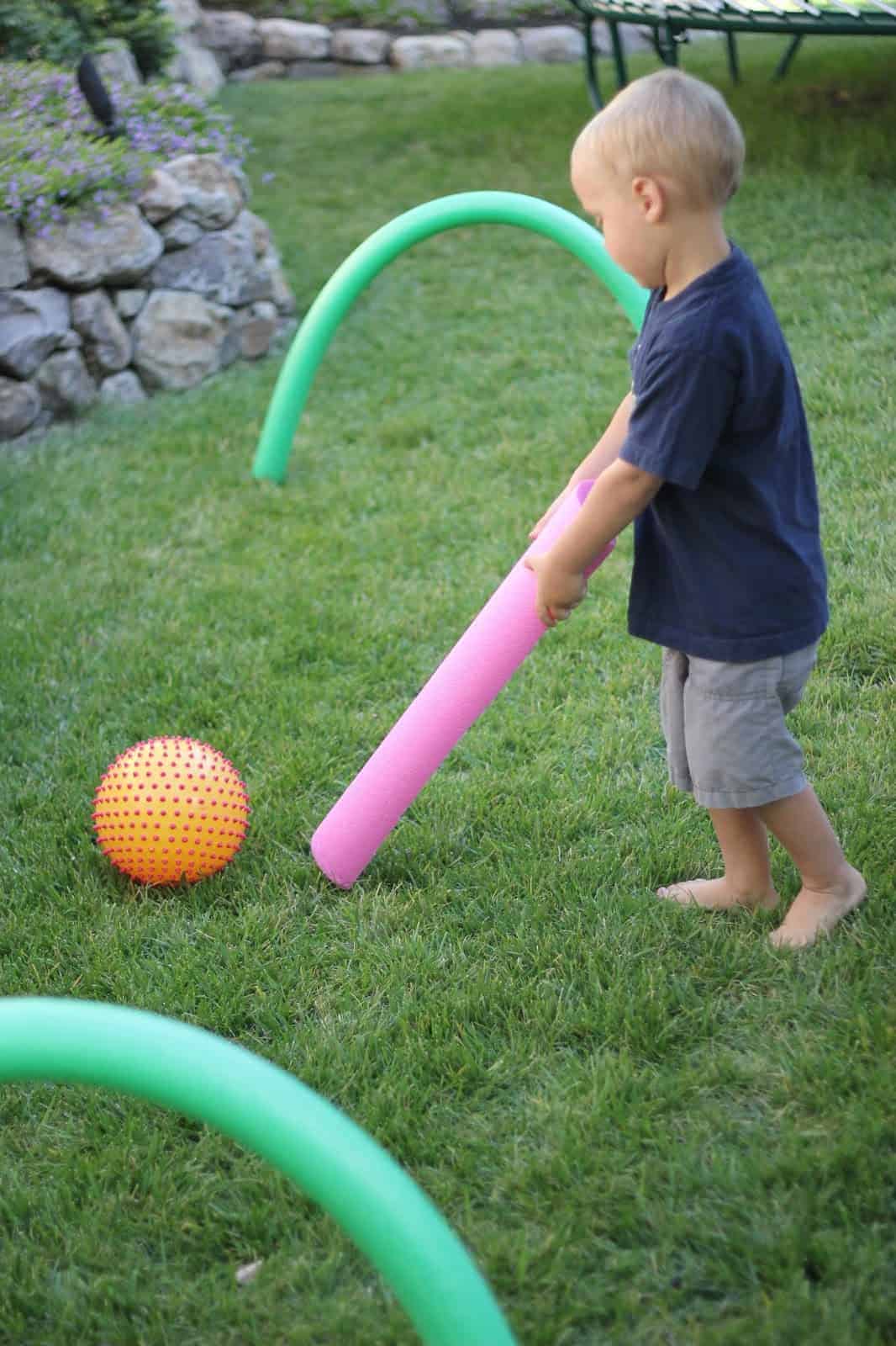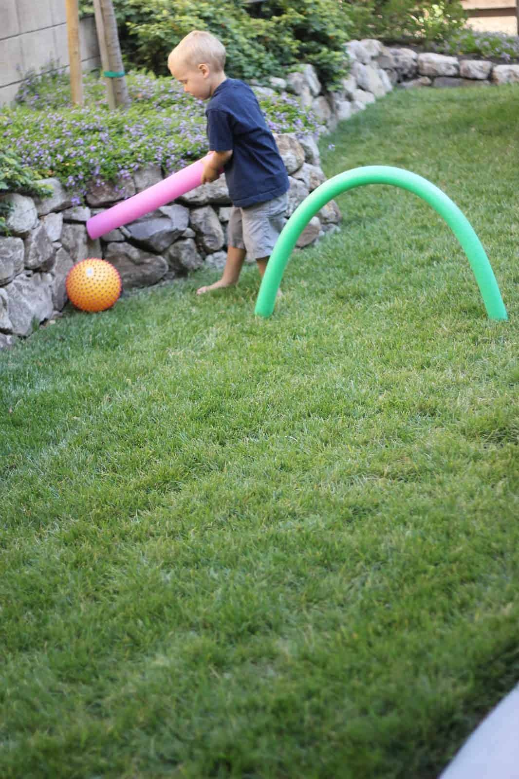 Next, cut the fat pool noodle in half lengthwise. The cut side of the pool noodle is a bit easier to hold on to and it is easier to hit balls with the fat pool noodle pieces.