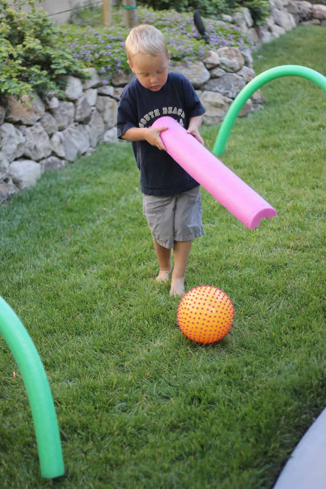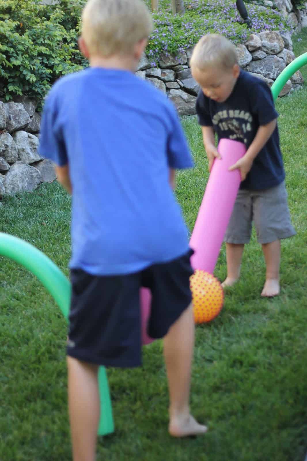 We made small teams of one and worked hard to get the ball in the other goal before it was stolen! Using the pool noodle half we hit the large ball again and again. My son was so proud of himself once he figured out how to "dribble" the ball up the field using his pool noodle.